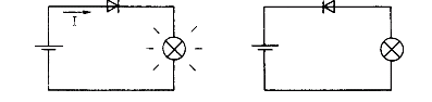 Schliesst man eine Batterie, mit ihrem Pluspol an die Anode einer Diode, von der Katode zur Lampe und zurück zur Baterie, so wird die Lampe brennen. Dreht man jedoch die Diode um, bleibt die Lampe dunkel.