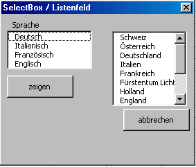 In unserem Beispiel ist die Sprachauswahlbox mit Werten anprogrammiert während die Landesauswahl mit einem Excel-Tabellenblatt verknüpft ist.