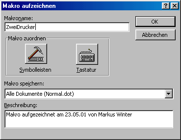 Sub ZweiDrucker() ' ' ZweiDrucker Makro ' Makro aufgezeichnet am 23.05.01 von Markus Winter ' ActivePrinter = "HP DeskJet 690C" Application.PrintOut FileName:="", Range:=wdPrintCurrentPage, Item:= _ wdPrintDocumentContent, Copies:=1, Pages:="", PageType:=wdPrintAllPages, _ Collate:=True, Background:=True, PrintToFile:=False, PrintZoomColumn:=0, _ PrintZoomRow:=0, PrintZoomPaperWidth:=0, PrintZoomPaperHeight:=0 End Sub