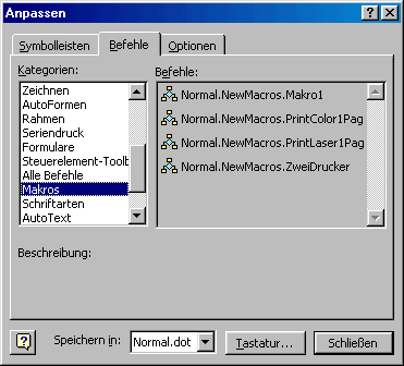 Sub PrintLaser1Page() vAlterDrucker = ActivePrinter ActivePrinter = "HP LaserJet 5" Application.PrintOut Range:=wdPrintCurrentPage ActivePrinter = vAlterDrucker End Sub