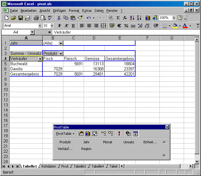 Im obigen Beispiel kann pro Jahr für welches Daten existieren ein Bericht erstellt werden. Die aktuelle Einstellung zeigt die Umsätze aller Jahre für die beiden Verkäufer in den Bereichen Fisch, Fleisch und Gemüse. Durch anklicken der grauen schaltflächen (Jahr, Produkt und Verkäufer) können diese Daten gefiltert werden.
