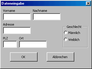 Es soll ein Dokument hergestellt werden welches beim öffnen automatisch eine Dialogbox zur Abfrage von: "Nachname, Vorname, Adresse, PLZ, Ort" anzeigt. Sobald der Anwender die Daten erfasst hat, sollen diese durch ein VB-Programm an die entsprechenden Positionen im Text eingefügt werden.