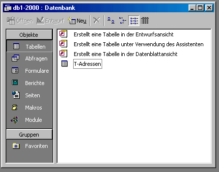 Nachdem eine Datenbank angelegt wurde, müssen in ihr Tabellen erstellt werden. Tabellen dienen zur Speicherung von Daten. Dabei spielt es keinerlei Rolle wie diese Daten formatiert sind, also ob fett, kursiv oder unterstrichene Informationen gespeichert wird. Formatierungen werden erst später in den Formularen definiert.