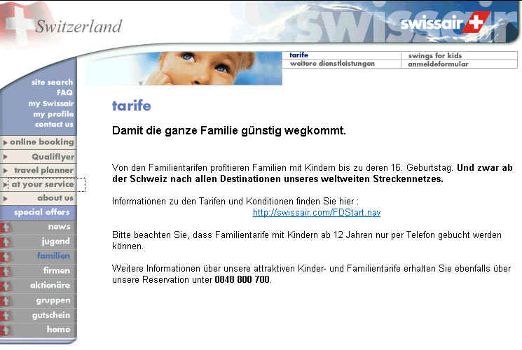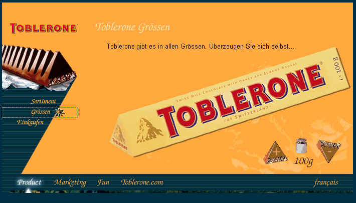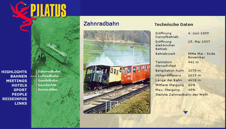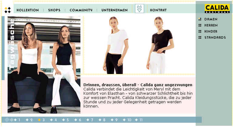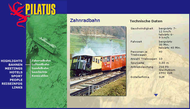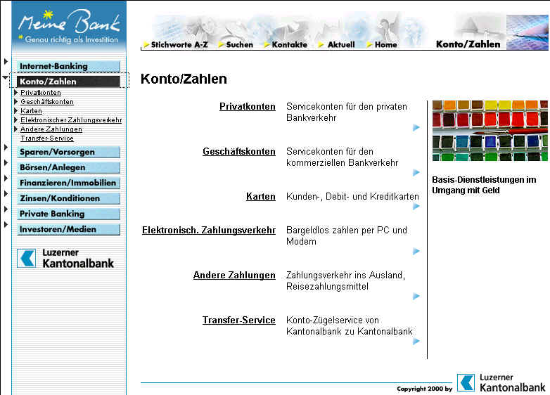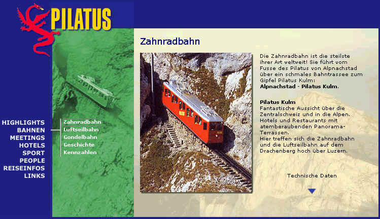 Die Navigation ist verteilt, oben, rechts und unten am Bildschirm. Durch das Verwenden von Bildern für die Navigationstexte wird die Ladezeit auf analog-Leitungen unnötig beansprucht.