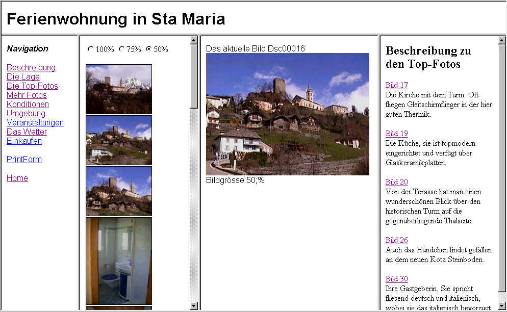 Die Bildergalerie der Ferienwohnung hat sehr gefallen. Auch bei der Anzeige eines Bildes bleiben die Thumbnails sichtbar. Es muss kein zusätzliches Fenster geschlossen werden oder zurück navigiert werden. Zusätzlich erscheint ein beschreibender Text. Je nach Bildschirmgrösse kann die Bildgrösse ausgewählt werden.