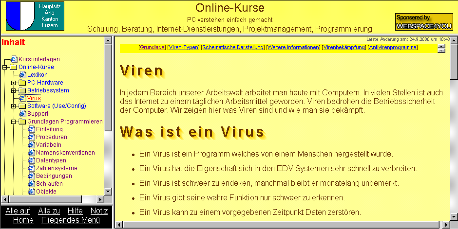 Unsere eigene Navigation zur Ansteuerung von über 5'500 Dokumenten. Auf der linken Seite dem Windows Explorer nachempfunden, in der Hoffnung, jeder Anwender kann diese bedienen. Es lassen sich mehrere Bereiche aufklappen. Innerhalb der Dokumente eine zweite Navigationsstufe mit einem i-Frame realisiert. Das Aktualisierungsdatum ist pro Dokument angegeben.