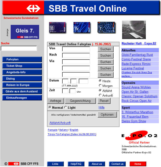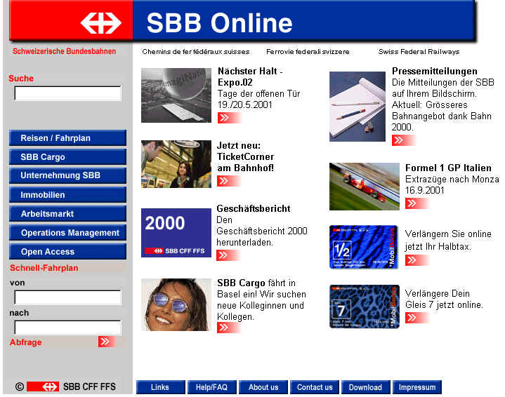 Eine deutliche Navigation der Bahn. Die meisten Personen interessieren sich wohl für den Fahrplan und den Arbeitsmarkt.