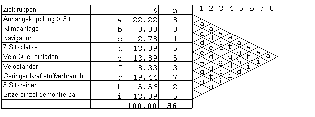 - Spalte 1 vergleicht Anhängekupplung mit Klimaanlage. A ist wichtiger