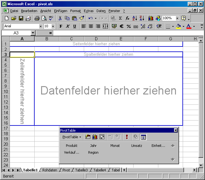 Die Datenfelder aus der Symbolleiste "PivotTabelle" werden mit der Maus in den vorgesehenen Bereich gezogen.