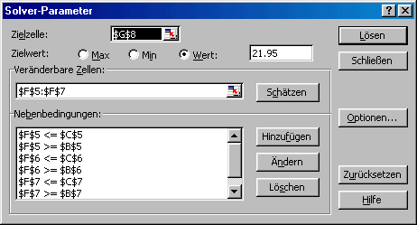 Für die Anteile gibt es Bedingungen welche vom Solver erfüllt werden müssen. Der Anteil von Zutat1 muss grösser als 1% und kleiner als 10% sein. Des sind bereits zwei Bedingungen (Wenn-Funktion). Total existieren 7 Bedingungen. Pro Zutat je zwei und zusätzlich muss das Total der Anteile genau 100% sein.