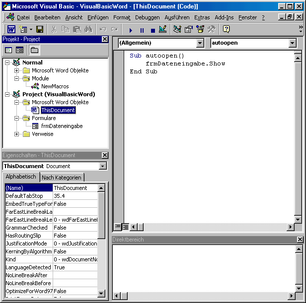 Weitere Auto-Funktionen sind: AutoClose, AutoPrint, AutoExec, AutoOpen. Es ist zu beachten dass diese Procedur entweder im Dokument oder in einem Modul des Projektes (der Vorlage) gespeichert ist.