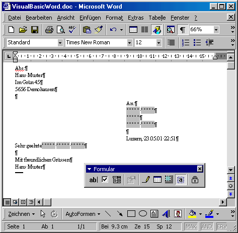 Private Sub cmdOk_Click() With ActiveDocument .FormFields("tmVorname").Result = Me.tbVorname .FormFields("tmNachname").Result = Me.tbNachName .FormFields("tmAdresse").Result = Me.tbAdresse .FormFields("tmPLZ").Result = Me.tbPLZ .FormFields("tmOrt").Result = Me.tbOrt If Me.obMann.Value = True Then .FormFields("tmGeschlecht").Result = "r" .FormFields("tmAnrede").Result = "Herr" Else .FormFields("tmGeschlecht").TextInput.Clear .FormFields("tmAnrede").Result = "Frau" End If .FormFields("tmAnredeName").Result = Me.tbNachName End With Me.Hide End Sub