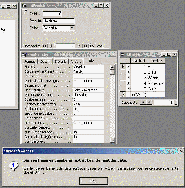 Der Anwender versucht eine Farbe zu erfassen welche in der tblFarbe noch nicht existiert. Es erscheint eine Fehlermeldung.