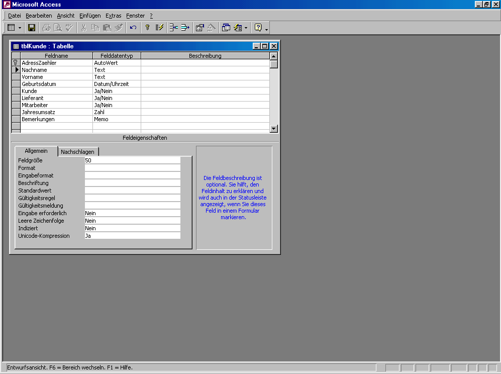 In der Spalte Felddatentyp ist zu bestimmen von welcher Art die zu speichernden Daten sind. Dies wirkt sich massgeblich auf den von der Datenbank benötigten Speicherplatz aus.